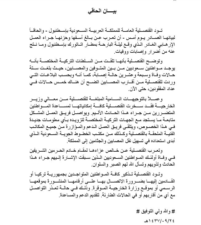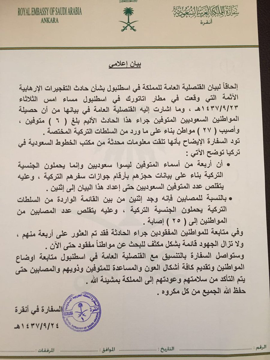 بيان إعلامي توضيحي من السفارة السعودية في أنقرة بشأن تفجيرات مطار أتاتورك الإرهابية في إسطنبول.